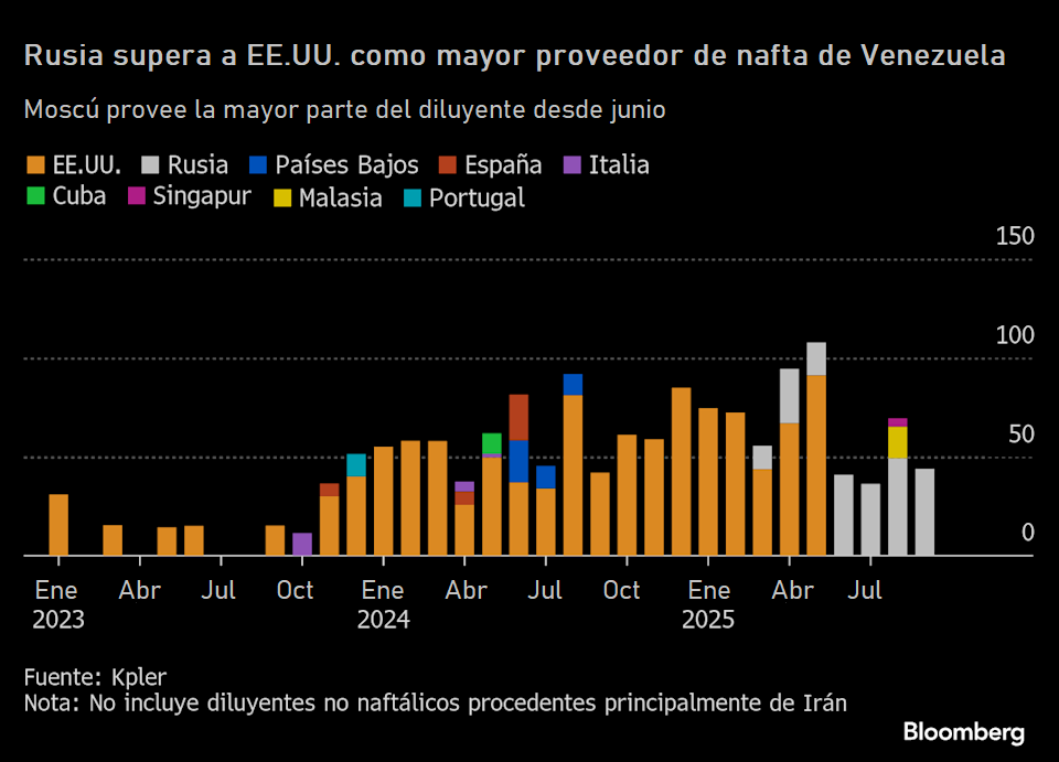 Los envíos de nafta desde EE.UU. cayeron a cero entre marzo y octubre, mientras que los flujos desde Rusia superaron los siete millones de barriles en el mismo período, según Kpler. Ese volumen, equivalente a unos 49.000 barriles diarios en agosto y 69.000 en septiembre, representa además la primera ola registrada de entregas desde Moscú a Caracas en casi seis años.